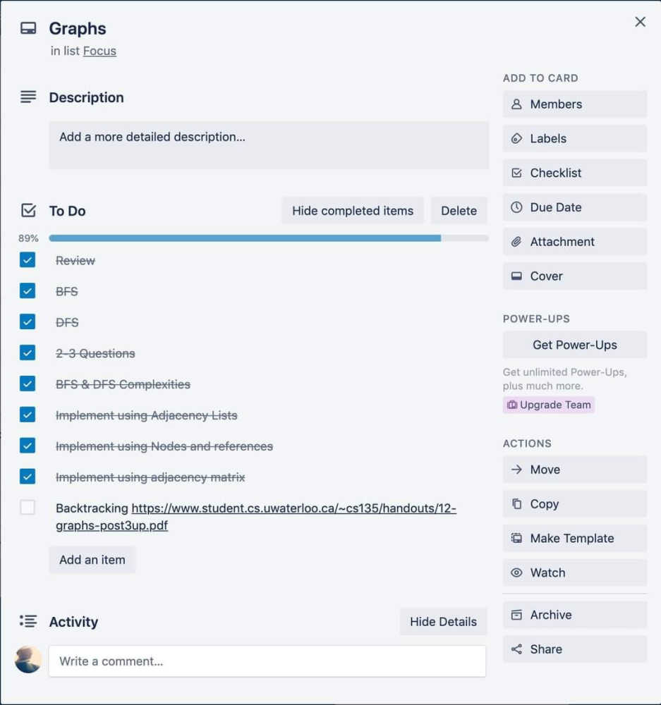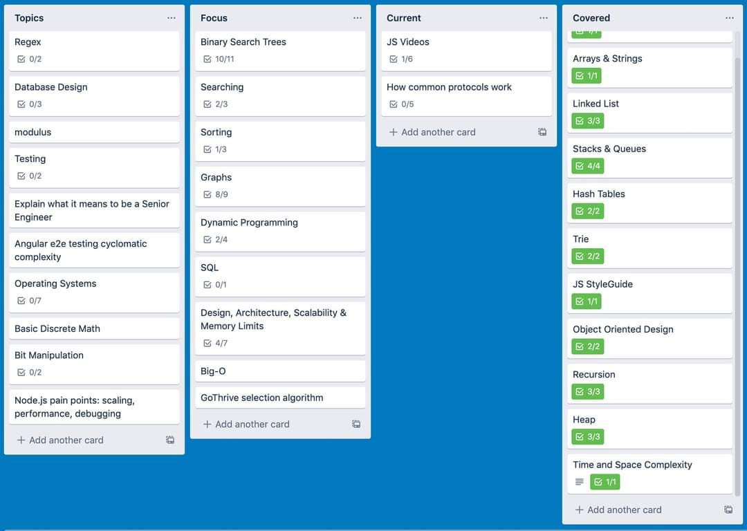 A common question people have is “how do I study”? It’s hard to know where to start, what to do next, if you’re making progress and even harder to stay on track. To solve a lot of these issues when I was studying, I created a Trello board with all the topics I wanted to cover.