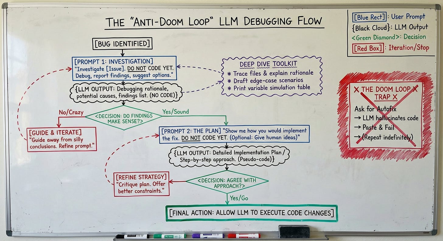 The way I’ve found to resolve doom loops of fake bug fixes is to tell it: “Investigate [insert issue here]. Do not code yet. Just debug and report back with your findings and a few suggestions for how to fix it”.